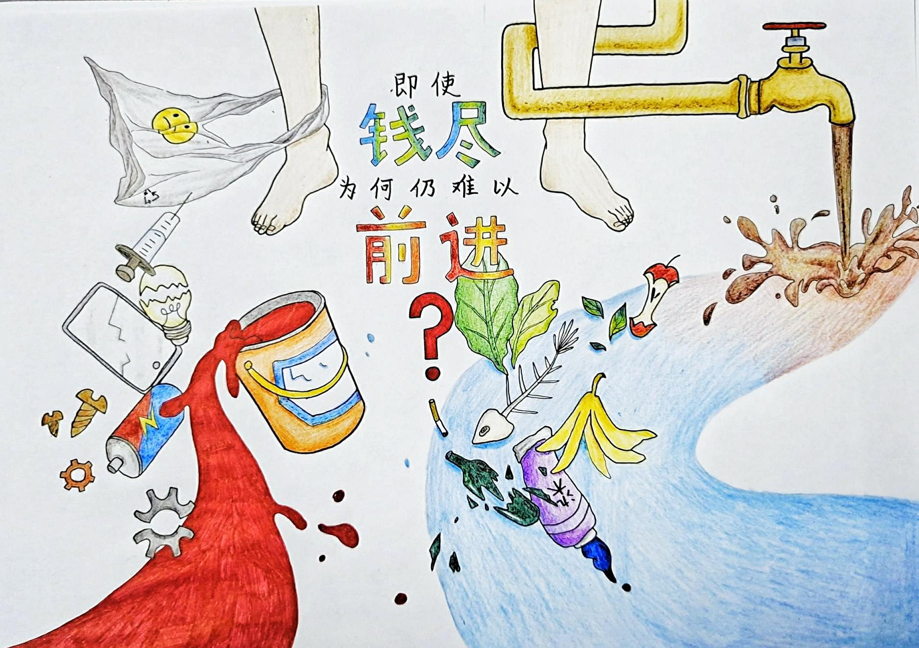 发布时间:2022-05-25 点击量:217本绘画作品以“保护环境,拒绝乱排乱放”为选题,生动地把排放到河流以及大自然环境中的污染物化作束缚在人类脚上的枷锁,并附上“即使‘钱尽’为何仍难以‘前进’?”的发问,阐述了人类若肆意排放污染物、丢弃废品,即使经济再发展也将寸步难行的道理。