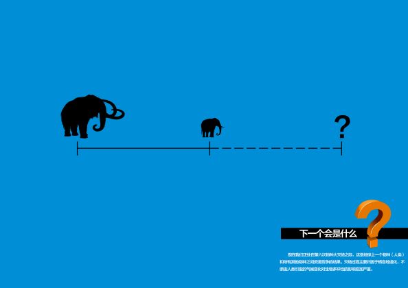 发布时间:2021-05-19 点击量:528本设计以从前远古生物到现在生物的一个过渡再到后面一个大大的问号,表示物种灭绝和生态系统退化迅速并不断加快。地球物种消失速度比自然灭绝的速度要快100到1000倍。 哥本哈根大学卡斯滕教授说,地球史上物种大规模的灭绝发生过五次,最近一次是发生在6500万年前的恐龙和其他许多物种的灭绝。现在我们正处在第六次物种大灭绝之际,这是地球上一个物种(人类)和所有其他物种之间资源竞争的结果。灭绝过程主要归因于栖息地退化,不断由人类引发的气候变化对生物多样性的影响愈加严重。 下一个会是什么?给我们人类一个问号,更是一个警示!